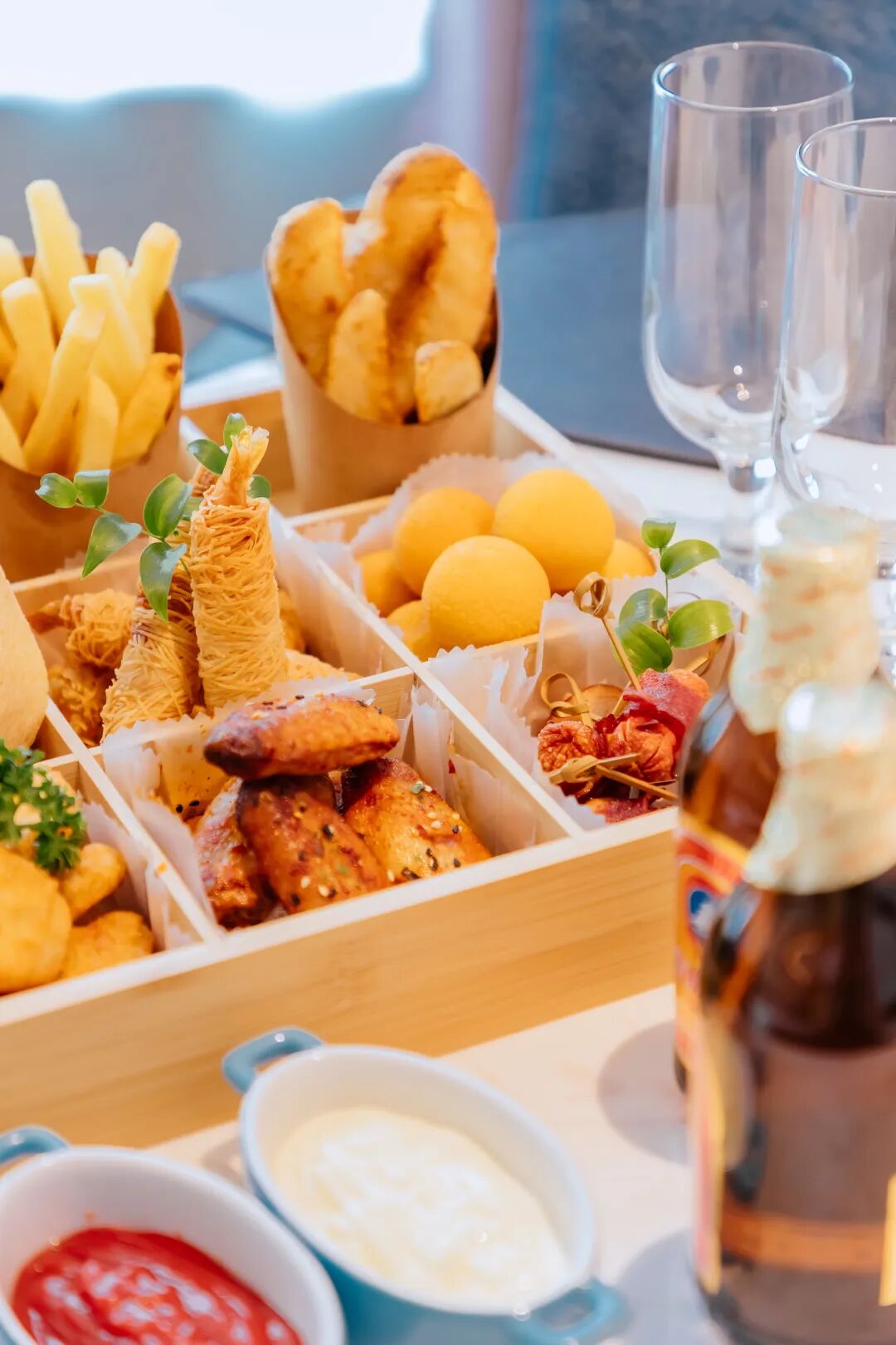 一份九宫格小食和两瓶啤酒